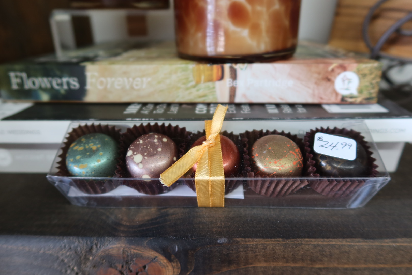 A selection of exquisite gourmet chocolate candies. Each piece is created in small batches with premium ingredients, offering a perfect harmony of sweetness, texture, and artistry to accompany your floral arrangement. These confections transform a thoughtful gesture into a full sensory experience.